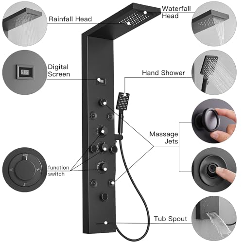 ?6 IN 1 Shower Panel?This shower tower features rainfall, waterfall shower head, 4 body jets, 4 mist sprays, 3 setting handheld shower wand and waterfall tub spout, a completer shower column system