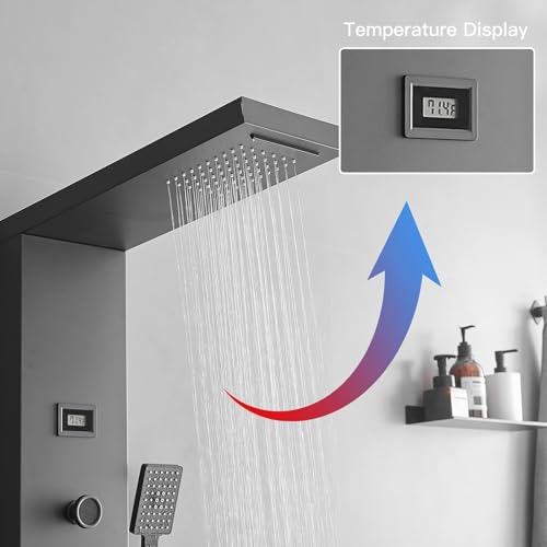 ?Shower Tower Material?The shower panel is constructed of precision high-grade 304 stainless steel to be durable, brass mixing valve and shower diverter valve included. Creating a New Look for your bathroom, enjoy SPA at your home.Temperature of the water can be displayed directly, so you could adjust water temperature for lower the scalding risk ( battery not included?need to buy separately).