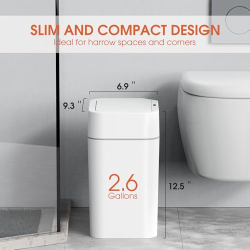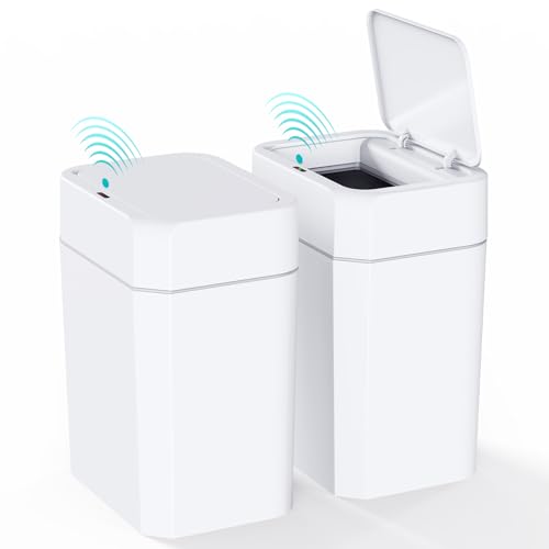 CEROELDA 2 Pack Motion Sensor Bathroom Trash Can with Lid, 2.6 Gallon Small Smart Automatic Touchless Garbage Can, Slim Waterproof Plastic Wastebasket for Bedroom Office Toilet, White