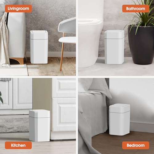 Compact Design: This set includes 2 sleek and modern bathroom trash cans, at 10.8''L×5.8''W×13.3''H and holding 2.6 gallons, these cans offer ample space for disposing of waste while maintaining a slim profile. perfect for small spaces like bathrooms, bedrooms, or offices