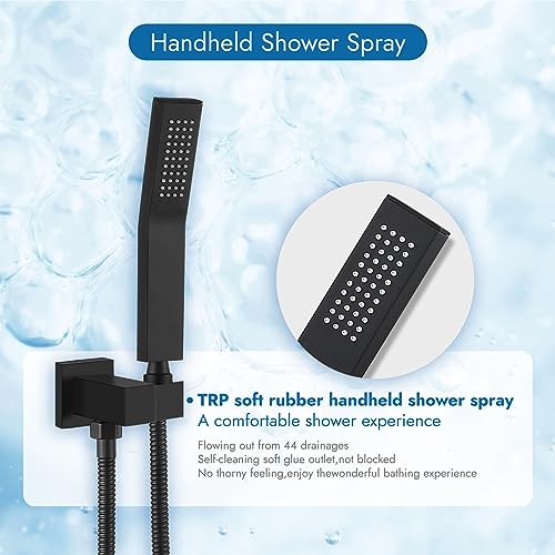 ?Premium Material?Cinwiny shower system with tub spout is made of premium metal with a matte black finish. The bend handheld spray is made of solid brass, which ensures durability and prevent discoloration. The solid brass rough-in valve can smoothly switch the 3 function while prevent leaking.