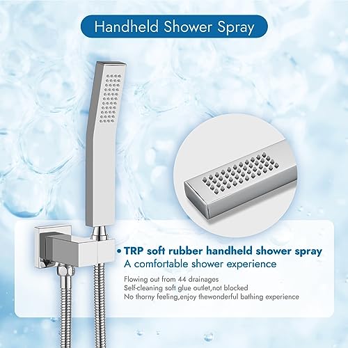 ?Premium Material?Cinwiny shower system with tub spout is made of premium metal with a polished chrome finish. The bend handheld spray is made of solid brass, which ensures durability and prevent discoloration. The solid brass rough-in valve can smoothly switch the 3 function while prevent leaking.