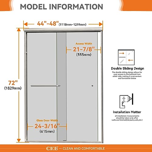 Easy Installation: Packaged in one carton for convenience, the kit includes two glass panels, hardware set, and step-by-step illustrated instructions. Compatible with CKB 48 x 32 inch shower base (ASIN: B0CB5SK333) – sold separately