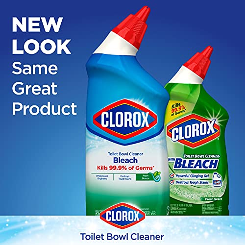 BLEACH TOILET BOWL CLEANER: Kills 99.9% of germs, and whitens and brightens your toilet bowl with the power of Clorox Bleach and leaves a refreshing Fresh Breeze Scent; Package may vary