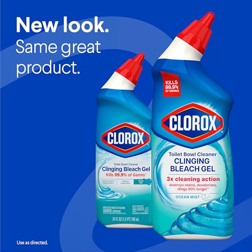 BLEACH TOILET BOWL CLEANER: Kills 99.9% of germs, inlcuding the COVID-19 Virus* and whitens and brightens your toilet bowl with the power of Clorox Bleach and leaves a fresh Ocean Mist scent; Package may vary