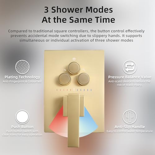 ?3 in 1 Push Button Valve?Compared to traditional square controllers, the button control effectively prevents accidental mode switching due to slippery hands. It supports simultaneous or individual activation of three shower modes: 12-Inch rainfall / 6-Inch Tilted shower / handheld shower. You can choose the mode that best suits your personal showering habits.