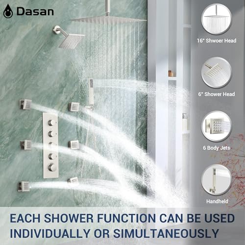 Dasan Thermostatic Dual Shower System with 6 Body Jets, 6-Inch Shower & 16” Rainfall Shower, Luxury Brushed Nickel Shower Faucet Set Rain Shower System for Couples/ 2-Person