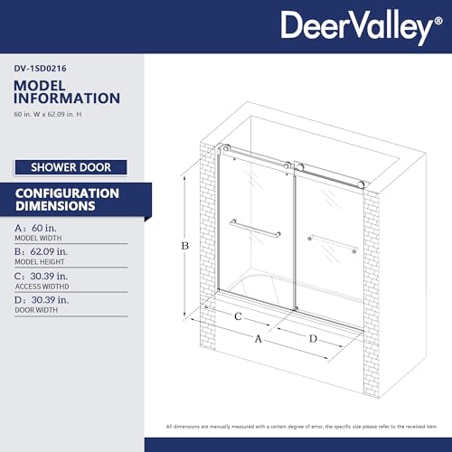 ?Bathtub Door Dimensions?– Adjustable 60"Wx62 3/8"H; Width Adjustment : 56- 60inch, Walk through opening width?26 11/16 -28 11/16 inch, The adjustable width of glass shower door makes it suitable even for small spaces. DeerValley bathtub shower door is designed to fit most standard bathtubs, providing a sleek, seamless look. Upgrade your bathroom with a stylish shower door that combines form and function.