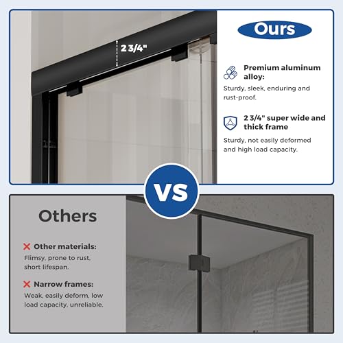 CLASSIC AND HIGH-QUALITY MATERIALS: The tub shower door's main structure is made of lightweight and enduring aluminum alloy with stunning and sophisticated matte black finish, which offers excellent corrosion and oxidation resistance, ensuring the stability and endurance of the shower door without deformation over time. High-quality hardware, such as rollers and stainless steel handles, withstand the test of time and extend the service life of the tub shower door.