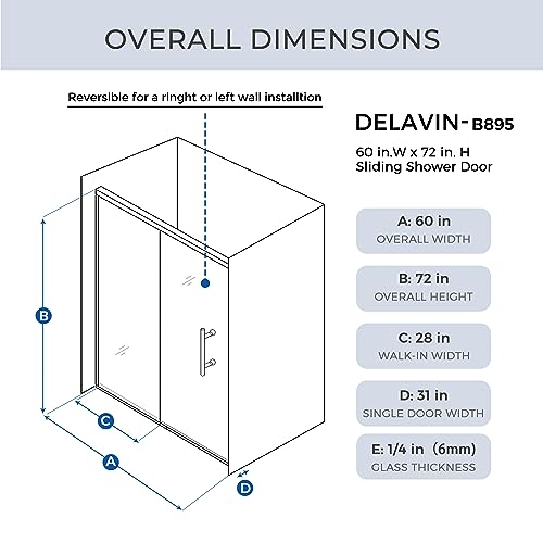 SAFE & STYLISH BATHROOM PARTITION: DELAVIN shower doors are made of high quality 1/4"(6mm) ANSI certified tempered glass for impact resistance and high tensile strength and transparent toughened crystal glass shows a simple and modern aesthetic style. The surface is covered with explosion-proof film, increase the strength of the glass, avoid the splinters splashing hurt. Tempered glass surfaces are smooth and easy to clean and maintain, keeping your bathroom clean and tidy at all times.