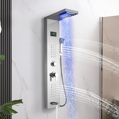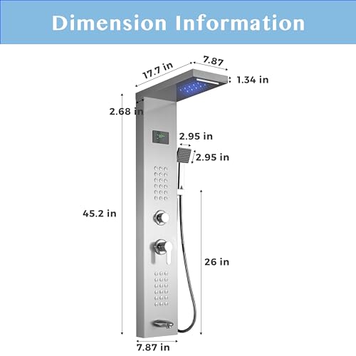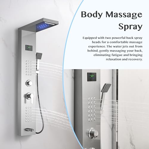 ?Massage Jets & Rotatable Hand Shower?This shower panel includes 2 back massage jets, which can give you the relaxation you want when you have done a lot of exercise and your muscles ache. The hand-held shower head can rotate on the bracket and is equipped with a long and flexible hose to easily reach places that are difficult to reach. The shower panel with LED display show the current temperature and bath time provides you with a new bathing experience.