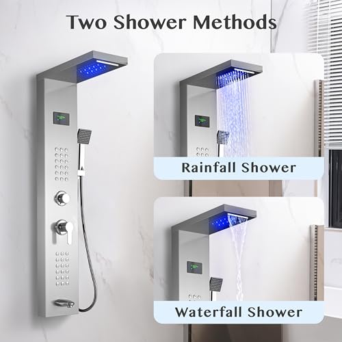 ?Multi-Function Shower Panel?The elegant modern brushed nickel shower panel is the attractive presence of each bathroom. This independent shower panel has 5 shower modes: Waterfall, Rainfall, Massage jets, Tub Spout and Handle Shower Head. With a high-quality shower panel and a convenient hand-held shower head, you can enjoy different shower functions while taking a shower and relax after a long time of work.