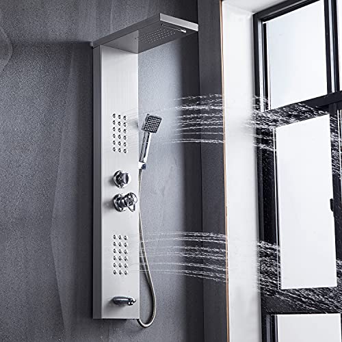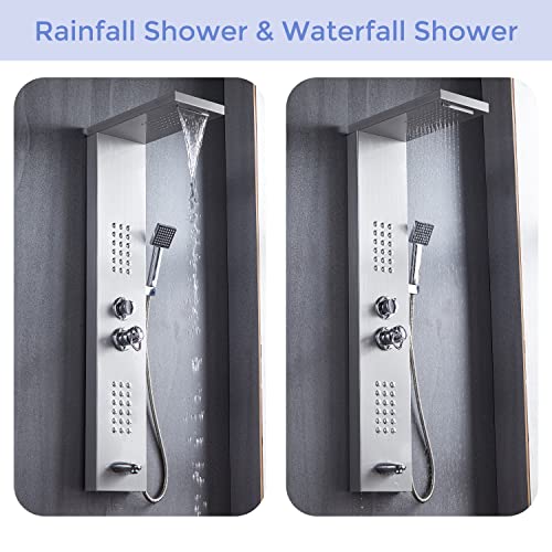 ?????Multi-Function Shower Panel?The elegant modern brushed nickel shower panel is the attractive presence of each bathroom. This independent shower panel has 5 shower modes: Waterfall, Rainfall, Massage jets, Tub Spout and Handle Shower Head. With a high-quality shower panel and a convenient hand-held shower head, you can enjoy different shower functions while taking a shower and relax after a long time of work.