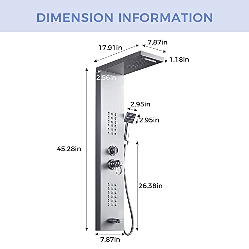 ?????High Quality Material?The high quality shower panel frame is made of ENDURING-304 stainless steel. No rusty, Long service life time. Environmental material, safe to use. All-in-one shower panel tower system designed for wall mount installation without difficult plumbing or drilling.