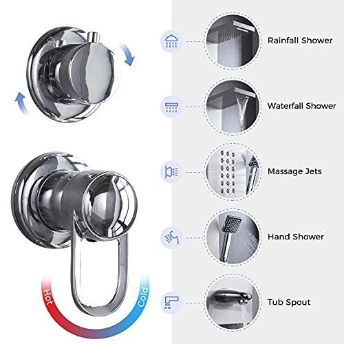 ?????2 Handle Control Centers?The shower panel has two handles for different functions. Water switch/temperature control: Use only one handle to turn water on/off and adjust hot and cold water; Function Converter: It can switch between functions of rainfall shower, waterfall shower, body massage shower, handheld shower and tub spout.
