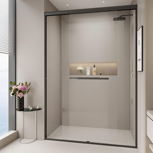 Customizable Fit: Adjustable width from 44" to 48" by cutting the guide rail for seamless installation. Semi-frameless bypass design with a sleek matte black aluminum frame and stainless steel handles, supporting up to 100 lbs.