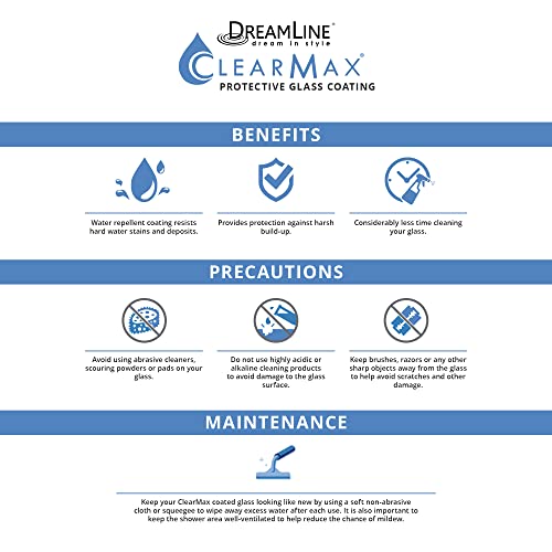 DreamLine exclusive ClearMax water and stain resistant glass coating; 5/16 in. (8mm) thick certified tempered glass; Glass Type: Clear