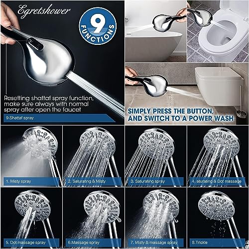 8+1 Spray Modes: Egretshower has 9 spray modes: Rain, Massage, Atomization, Sweeping, Multiple Combination Modes and Pause Water Saving Mode, also suitable for baby showers. Different from other shower mode functions - the super strong spray mode keeps you away from bathroom cleaning problems, just press the button on the back of the shower head to help you clean the toilet, bathtub and bathroom corners from dirt or stubborn substances. Also ideal for pet showers, easily removes suds.