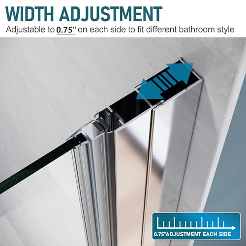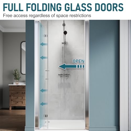 Flexible and Saving Space: The hinges and pivots allow an overlapping rotation angle of 180 degrees, flexible and pleasant, making this bifold glass shower door suitable for installed in corners and ideal for small bathrooms
