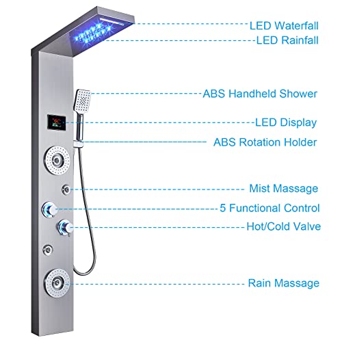 Luxury shower panel has built-in LED overhead rainfall waterfall showerhead, a multi-function handheld shower wand, rain massage and mist massage. Hydroelectricity Temperature display that assist you to select the best water temperature.