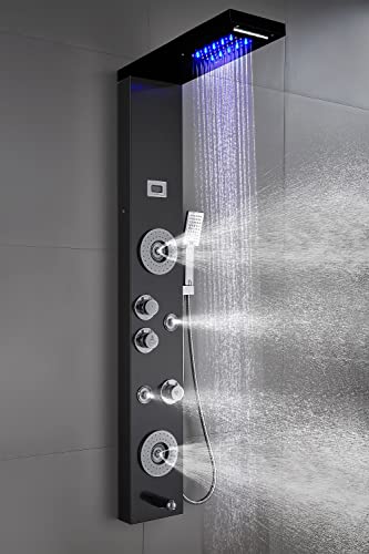 Luxury shower panel has built-in LED temperature display, LED overhead rainfall showerhead, adjustable high-powered body massage jets, tub spout, and high-efficiency multi-function handheld shower wand