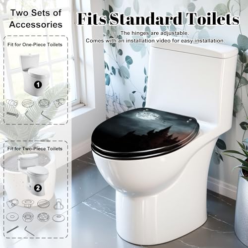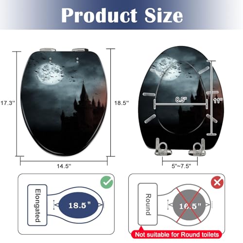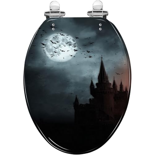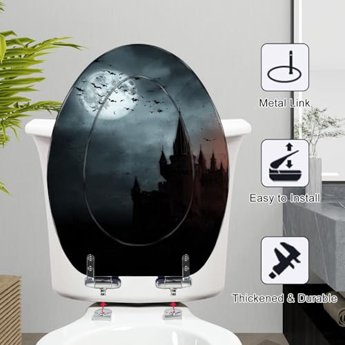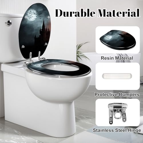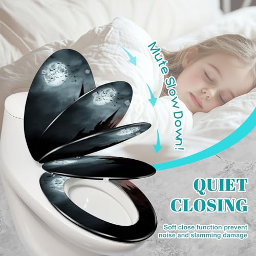 Elongated Toilet Seat Bats empty town Resin Toilet Seat Slow Quiet Close Lid with Quick-Release Hinges Cover Bumpers Easy to Clean Install