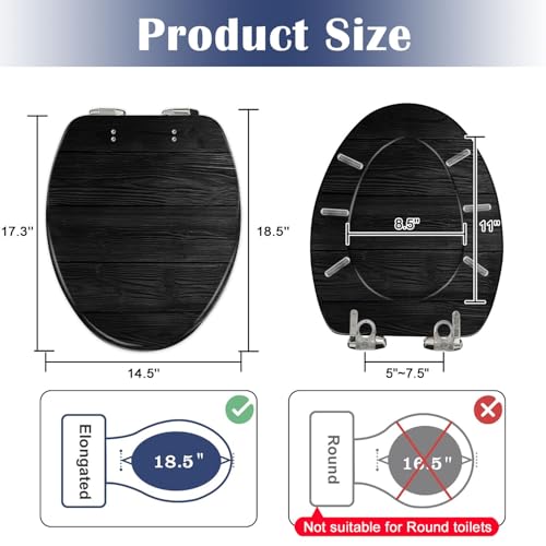 Elongated Size: Please measure your toilet bowl to confirm you need an ELONGATED size. Our extended toilet seat measures 18.5 inches in length and 14.5 inches in width. Please measure the size of the toilet before purchasing to ensure that it can match. Hinges are adjustable to adapt to elongated standard toilets.