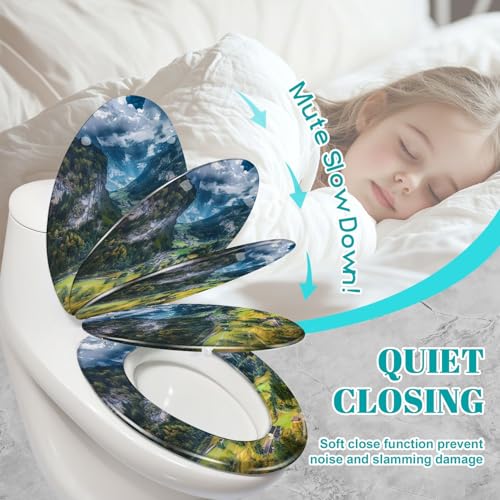 Elongated Toilet Seat Lauterbrunnen valley famous church Staubbach waterfall Lauterbrunnen Resin Toilet Seat Slow Quiet Close Lid with Quick-Release Hinges Cover Bumpers Easy to Clean Install