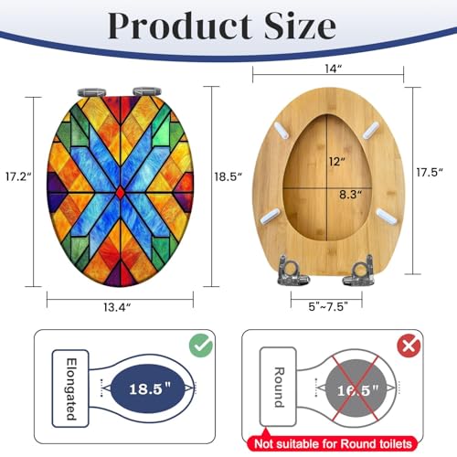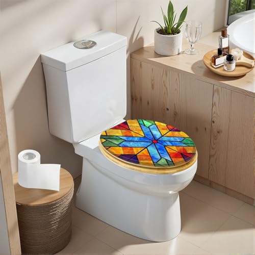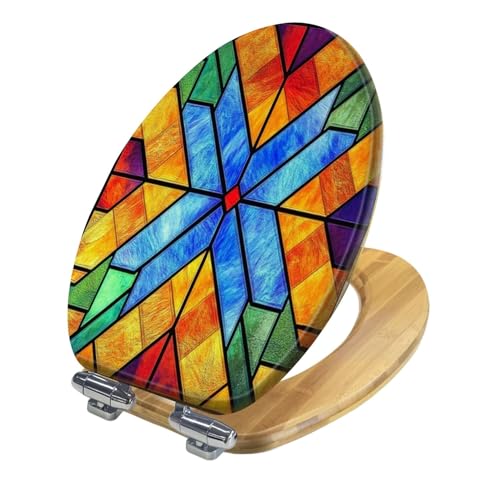 Elongated Toilet Seat Wooden colored stained glass window Church Abstract stained glass Wood Toilet Seat Slow Quiet Close Lid with Quick-Release Hinges Cover Bumpers Easy to Clean Install