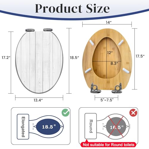 Elongated Size: Please measure your toilet bowl to confirm you need an ELONGATED size. Our extended toilet seat measures 18.5 inches in length and 14 inches in width. Please measure the size of the toilet before purchasing to ensure that it can match. Hinges are adjustable to adapt to elongated standard toilets.