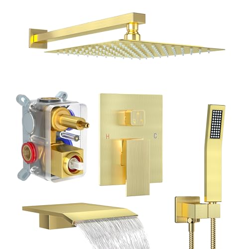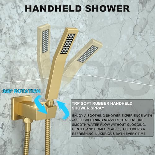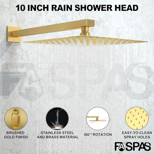 Adjustable Rain Shower Head and Multi Function Shower System: The 10 " Ultra-Thin rainfall shower head and handheld shower head can be adjusted flexibly to achieve the perfect angle for your shower area. The brushed gold shower fixtures allow for easy switching between the rain shower head and the handheld shower head, delivering a wide range of soft rain spray
