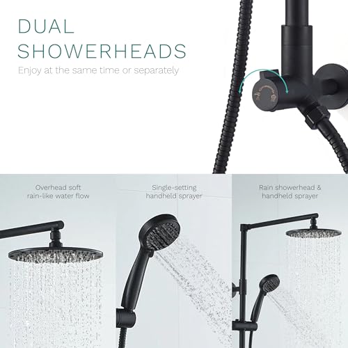 Dual Shower Heads Work Simultaneously: You can enjoy both the rainfall showerhead and high-pressure handheld sprayer at the same time or separately. Lightweight handheld showerhead with flexible 5’ hose has 3 settings (relax, massage and full spray), slides up and down for ideal height and angle adjustment - accessible, kid-friendly, and pet-washing made easy