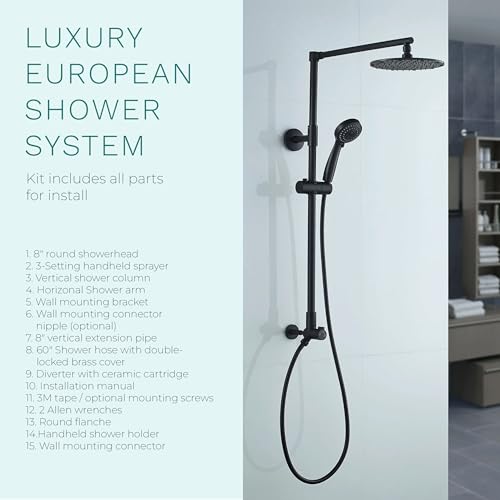 High-Quality, Anti-Leak Shower System: Crafted for durability, the shower column, arm, and diverter are made with 100% brass, for a reliable leak-free connection and corrosion resistance. The lightweight handheld shower head is designed with ABS Composite Plastic for ergonomic handling and enhanced safety. Has a 2.5 GPM flow rate for top-notch water pressure. Enjoy a rain shower experience with a soft, rain-like water flow that works even with low water pressure