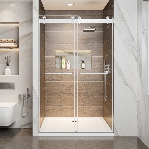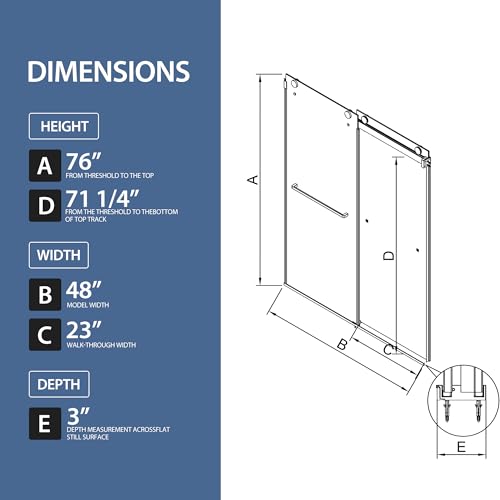 [Frameless Shower Door] The Aurisal glass shower door features size 48" W x 76" H, with the adjustable width 44" to 48" by cutting guide rail, offering flexibility to fit various bathroom layouts. The sliding shower door frameless design can save you 25% space during installation, and don't worry about the risk of hitting your head due to the height.