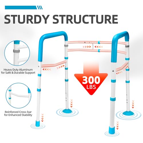 ????? Enhanced Stability?Our Toilet Safety Rail has been engineered with your stability as the top priority, is made from rustproof thicker aluminum, reinforced cross-bar and "E" Clips offering enhanced durability which can hold up to 300lbs. Great for elderly, senior, handicap and adults after knee or hip surgery.