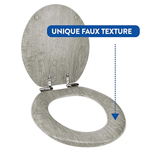 MODERN DESIGN: Distressed grey wood toilet seat with chrome-plated hinges is a stylish way to round out any bathroom décor.