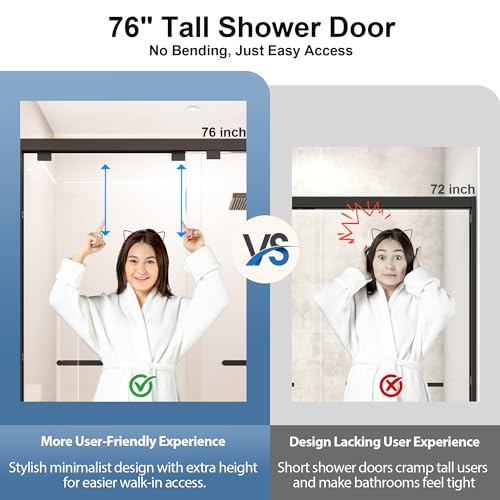 76-inch Height: The height of the semi-frameless shower door is 76 inches, allowing anyone to enter without bending down, making the bathroom look more elegant. The adjustable width range is 44-48 inches