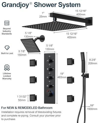 ?Hassle-Free Easy Installation? Effortlessly install the Grandjoy Multiple Shower System using the included instructions and parts. The system features universal 1/2" NPT tapered threads for compatibility with US and Canadian homes.