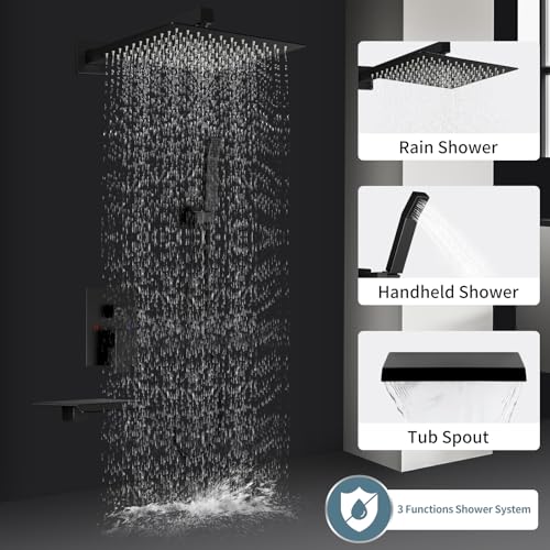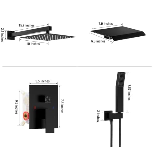 Includes:10" square fixed shower head,hand-held shower head with Sprayer , tub spout, shower arm wand,shower hose,shower holder and Shower Faucet Rough-in Valve Body.