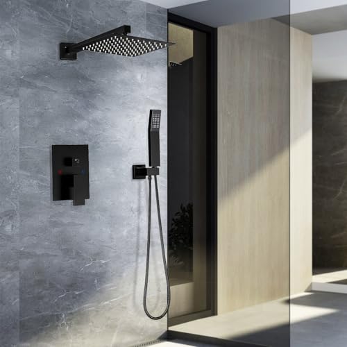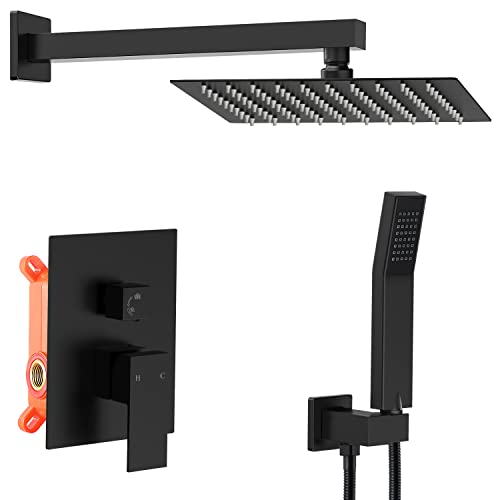 Includes:10" square fixed shower head, hand-held shower head with Sprayer , shower arm wand, shower hose, shower holder and Shower Faucet Rough-in Valve Body, material ensures resistant and protect your skin from pollution,stainless steel offers nice-looking,resistance corrision and resistant