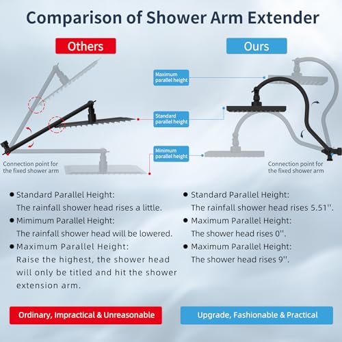 ?Adjustable Shower Arm Extension?12 Inch upgraded curved shower head arm extension is made of solid brass and stainless steel. It fits any rain shower head or handheld shower head, the height can be adjusted up and down, the shower head is always vertical in your large size and will not hit the shower arm, instead of slopping water like ordinary straight shower arms. Curved shape design enhances its bearing capacity, high rises your shower head, and can achieve vertical water.