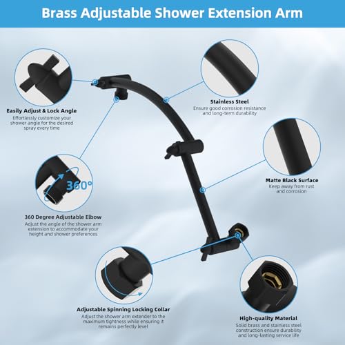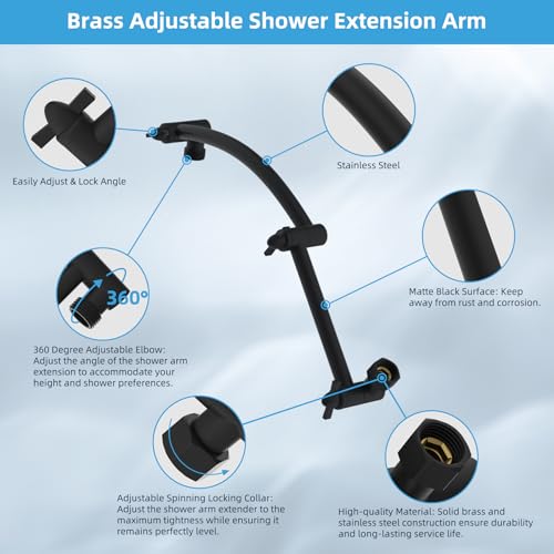 ?16'' Adjustable Shower Extension Arm?The 16'' arc-shaped shower head extension arm, with adjustable height and angle, not only adds a touch of elegance to your bathroom but also enhances its load-bearing capacity. This innovative design ensures that the shower head remains vertical and at the perfect height without hitting the shower arm. You can easily adjust the extension arm to achieve the perfect shower position, providing a comfortable and enjoyable bathing experience.