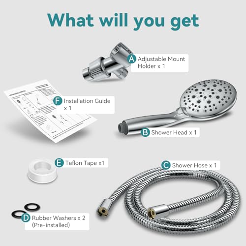 Effortless Manual Installation: No need for a plumber or any tools. Just follow the instructions, even a teenager, an elderly or a woman, can finish the installations in 1 minute with all the necessary components included in the package. All the necessary accessories are included in the package, including adjustable shower holder, extra rubber washer, 6-mode high flow shower head, anti-leaking teflon tape, detailed installation guide and 59 Inches stainless shower hose.