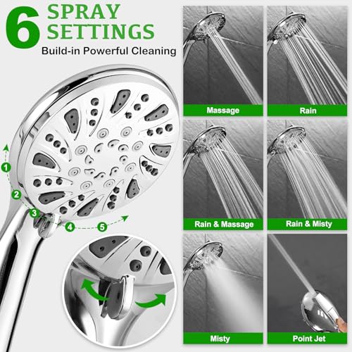 [ 6 SPRAY MODES WITH BUILT - IN POWER WASH ] : OHDAY Handheld shower head has 6 settings for choice , which gives you a different shower experience . Especially the Built-in Power Wash mode , With just a simple press of the back button on the hand shower heads , it transforms into a powerful spray mode ! It serves as a reliable assistant for pet bathing , cleaning toilets , mopping , tile walls , tubs , and hard-to-reach corners