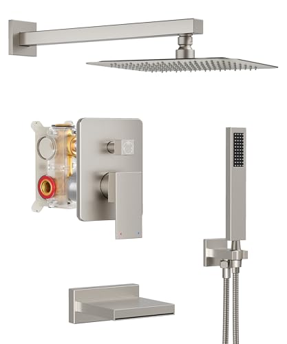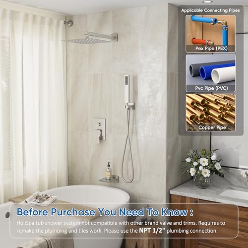 HoliSpa Shower System with Tub Spout, All Metal Tub Shower Faucet Set with 10" Rain Shower Head and Handheld Spray combo, Wall Mounted Tub Shower Systems with Valve and Trim Kit, Brushed Nickel