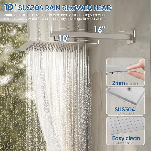 RAINFALL SHOWER HEAD: Made of high-quality 304 stainless steel, 10 inches large size provides a full cover for your body and the ultra-thin design delivers a soothing cascade of water, creating a spa-like shower for you