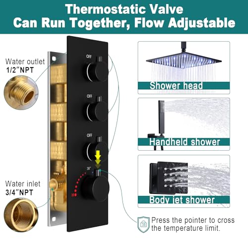 ?GENEROUS FLOW RATE?3/4"" HOT AND COLD WATER INLETS HAVE MORE FLOW THAN 1/2"" INLETS. The three-way thermostatic shower valve comes with 3/4-inch hot and cold water inlets and three 1/2-inch outlets. More powerful water flow when you turn on the switch handle. Fill the tub quickly.
