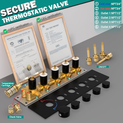 ?4-Way Thermostatic Valve?Brass valve maintains stable water temperature at 100°F / 38°C to prevent scalding. Features 3/4" NPT hot/cold water inlets and 1/2" NPT water outlets for overhead, handheld, jets.