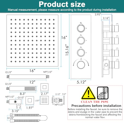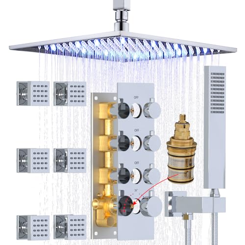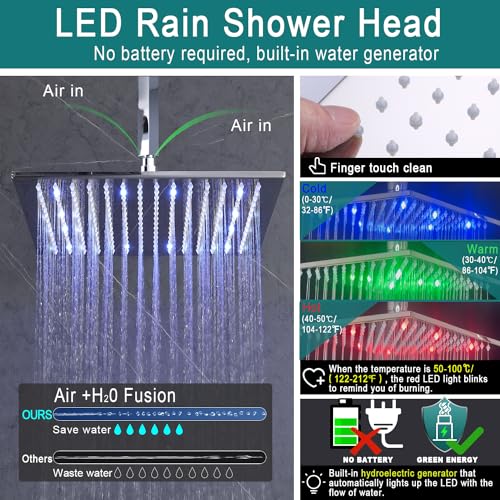 ?ROMANTIC LED RAIN SHOWER?LED generates electricity with the massive flow of water from the 16" oversized shower head, no need to connect to a power source, there STRONG SAFETY GUARANTEE!!! LED's unique design, the color will change with the temperature, *Blue 0-30C (32-86°F), *Green 30-40C (86-104°F), *Red 40-50C (104 -122°F), *Flashing Red 50C-100C. You will have a fantastic shower experience.