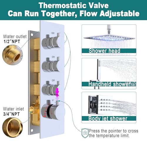 ?GENEROUS FLOW RATE?3/4"" HOT AND COLD WATER INLETS HAVE MORE FLOW THAN 1/2"" INLETS. The three-way thermostatic shower valve comes with 3/4-inch hot and cold water inlets and three 1/2-inch outlets. More powerful water flow when you turn on the switch handle. Fill the tub quickly.